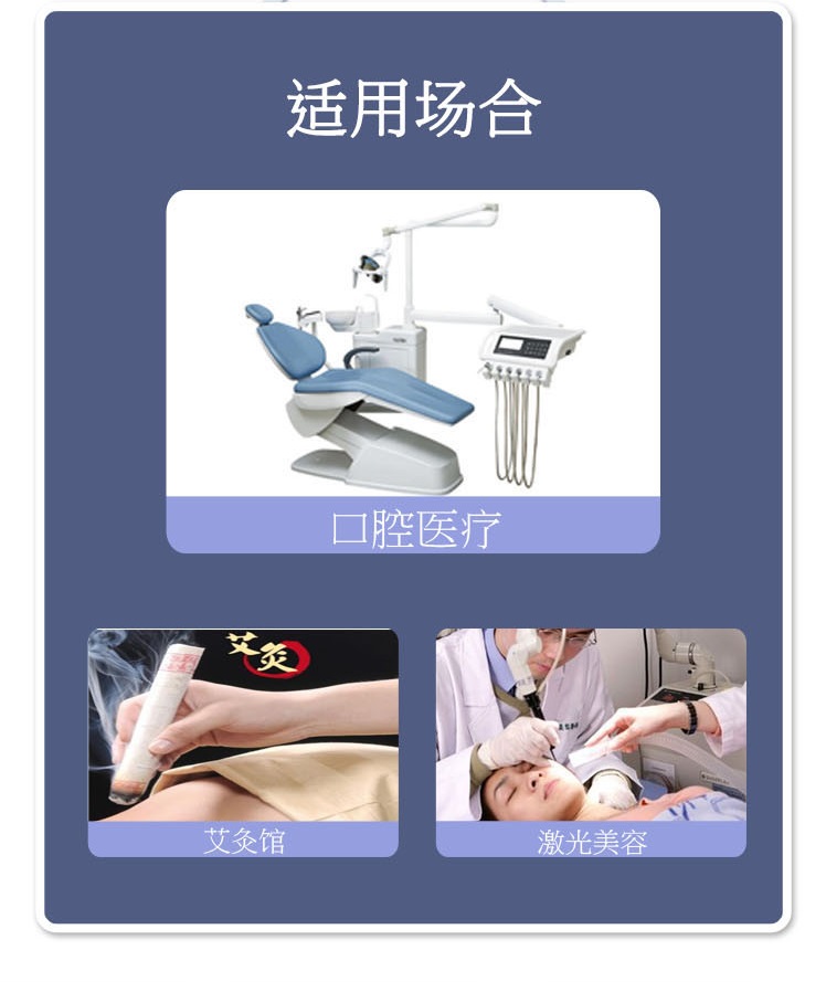 主要應(yīng)用:醫(yī)療美容、艾灸、口腔氣霧、實驗室等煙塵凈化