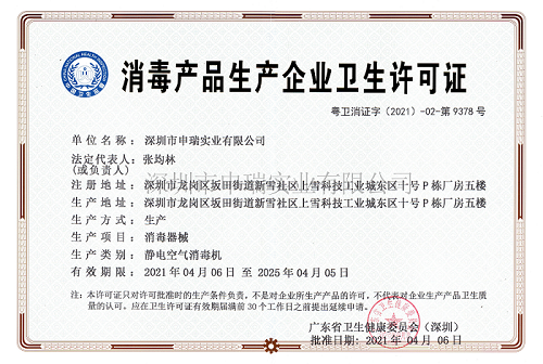 面對疫情防控的嚴峻形勢,申瑞積極響應政府號召和要求,高度關注疫情進展,全力支持抗擊疫情。在國家相關政策支持下,申瑞嚴格遵守消毒產品生產企業的法律要求申請辦理相關資質,并于近日獲批廣東省衛生健康委員會頒發的《消毒產品生產企業衛生許可證》,生產類別為靜電空氣消毒機。